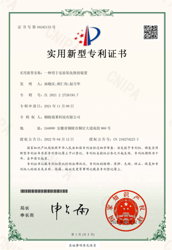 堅持成果培育轉化。持續強化對“雙平臺”(瑞萊科技公司擁有“安徽省企業技術中心”和“安徽省工程技術研究中心”)的維護,組織實施階段性科研任務,提前完成了安徽省企業技術中心2022年度評價工作;積極開展銅陵市“1155”創新創業專業技術人才團隊年度考核以及“2021年度能效領跑者”項目申報。以專利為突破口,加強科技成果的培育和轉化,今年以來,完成2項安徽省科技成果登記,完成4項專利申報(其中發明專利2項,實用新型專利2項),成功獲得實用新型授權專利2項,累計專利總數達78項,遙遙領先行業其他企業。同時努力推動專利成果在公司生產經營中的應用,大大提升了公司在激烈市場中的競爭力。2022年第一季度瑞萊科技公司全面完成了各項生產經營指標,成功實現了“開局穩”、“開門紅”。