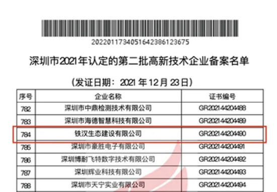 根據(jù)《高新技術(shù)企業(yè)認(rèn)定管理辦法》(國(guó)科發(fā)火〔2016〕32號(hào))和《高新技術(shù)企業(yè)認(rèn)定管理工作指引》(國(guó)科發(fā)火〔2016〕195號(hào))文件規(guī)定,經(jīng)審核推薦、前置審查、專家評(píng)審、公示、申請(qǐng)備案等程序,全國(guó)高企認(rèn)定辦對(duì)深圳市2021年第二批認(rèn)定的鐵漢生態(tài)建設(shè)有限公司等企業(yè)予以高新技術(shù)企業(yè)備案。