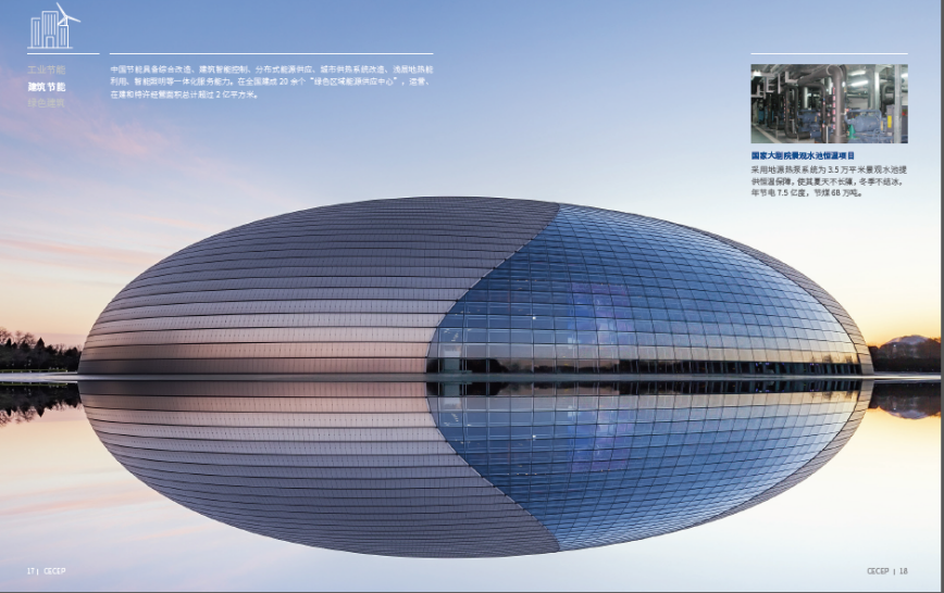 采用地源熱泵系統(tǒng)為3.5萬(wàn)平方米景觀(guān)水池提供恒溫保障,年節(jié)電7.5億度,節(jié)約標(biāo)煤68萬(wàn)噸。