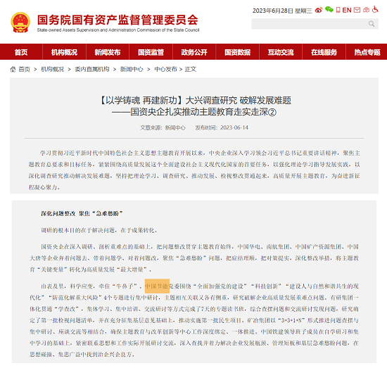 ?近日,中央主題教育官網、國資委網站、“國資小新”新媒體平臺、國資委主題教育簡報多篇次、高頻次報道中國節能開展主題教育的特色亮點和經驗做法,《習近平經濟思想研究》期刊特別刊發中國節能黨委書記、董事長宋鑫有關充分發揮主題教育牽引力作用,推動長江經濟帶高質量發展的署名文章,對中國節能扎實推動主題教育走深走實的具體實踐給予高度評價。